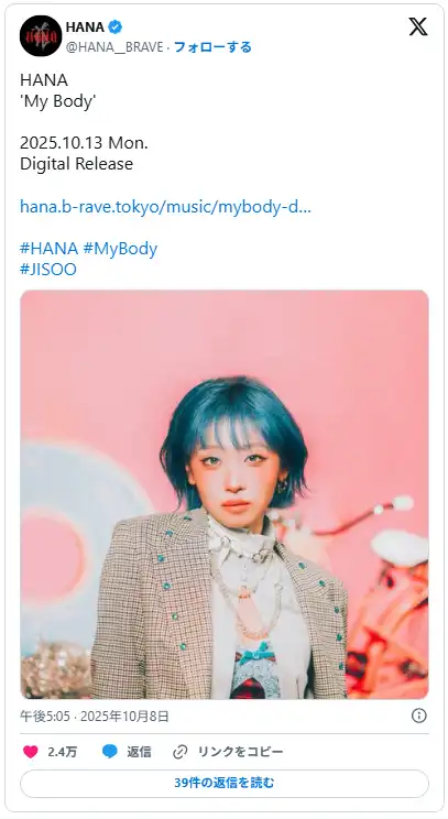 | 最近の活動 | – 2025年10月13日:「My Body」リリース。JISOOさんのソロパートが「感情の爆発」と話題。 – ファンミーティング「HANA with HONEYs」(2025年夏~秋):ファンとの交流で「優しいお姉さん」ぶりが好評。 – 公式X(@HANA__BRAVE)で公開されたビハインド映像では、メンバーと笑顔で戯れる姿が「癒し」と話題。 |