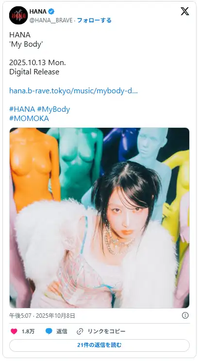 | 最近の活動 | – 2025年10月13日:「My Body」リリース。MOMOKAさんのダンスパートがMVのハイライトとして話題に。 – ファンミーティング「HANA with HONEYs」(2025年夏~秋):ファンとのダンスチャレンジ企画でリードし、「親しみやすい」と好評。 – 公式X(@HANA__BRAVE):公開された練習動画で、MOMOKAがメンバーと振付を調整する姿が「プロ意識高い」と反響。 |