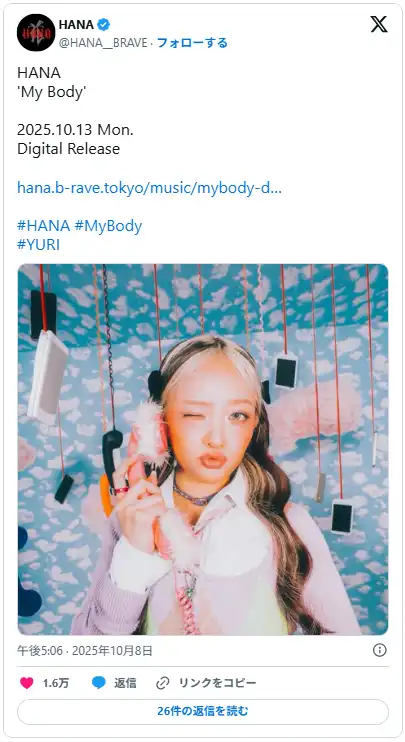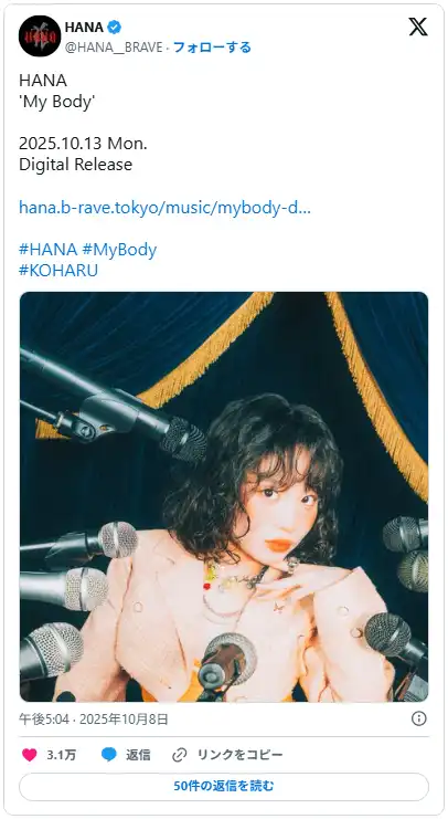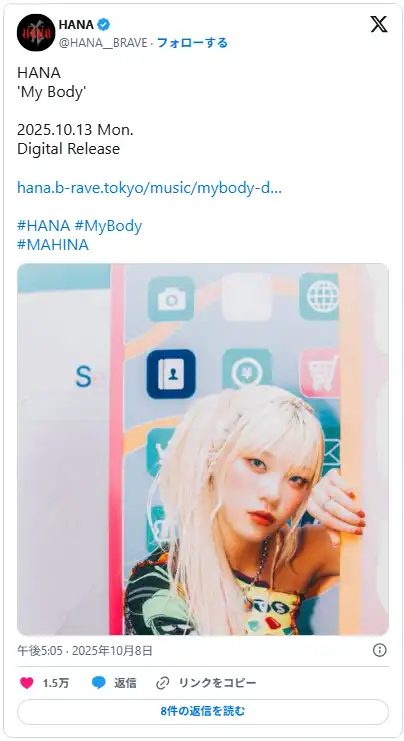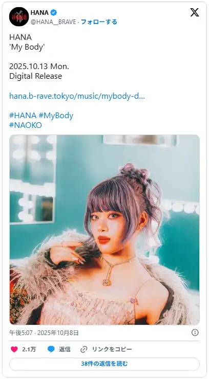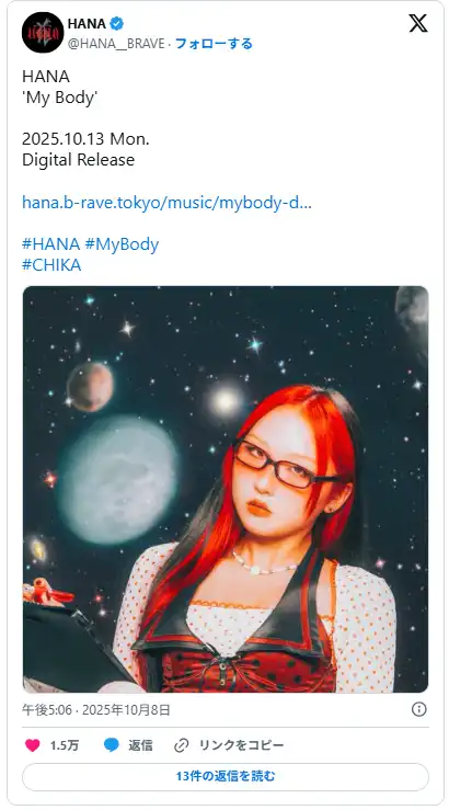 | 最近の活動 | – 2025年10月13日:「My Body」リリース。CHIKAのソロパートが「感情の爆弾」と話題に。MVでの表現力も注目。 – ファンミーティング「HANA with HONEYs」(2025年夏~秋):ファンとのトークで「歌でみんなを癒したい」と語り、好感度アップ。 – 公式X(@HANA__BRAVE):公開されたリハーサル映像で、CHIKAがメンバーと歌のハーモニーを調整する姿が「プロ」と反響。 |