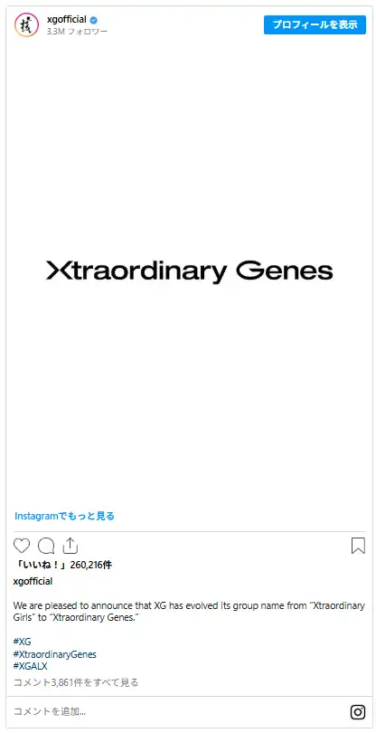 メンバー全員が20歳を迎えた節目に元々「Xtraordinary Girls」の略だった「XG」を、「Xtraordinary Genes」に進化。「Genes」には「核(CORE)に宿る力・創造性・常識を超える精神」が込められています。