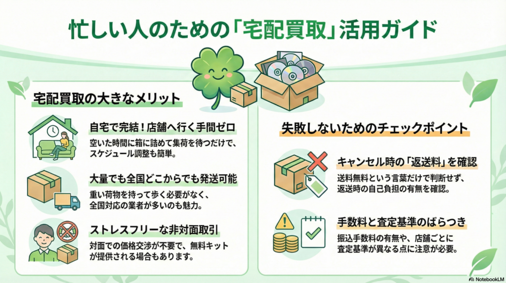 買取業者への依頼は「高く売る方法」ではありませんが、時間や手間を減らす方法ではあります。まず大きいのは、手間が少ないことです。