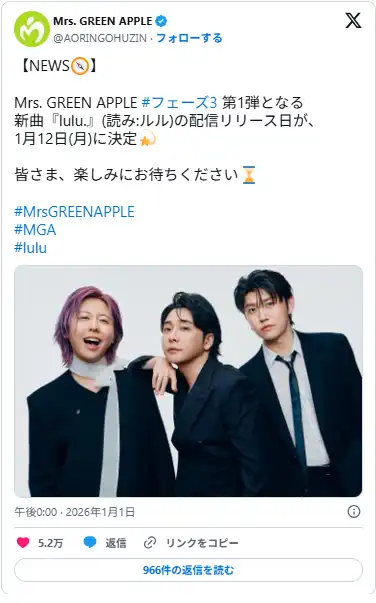 2026年1月1日、Mrs. GREEN APPLEは新たにフェーズ3へと突入しました。