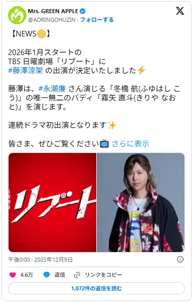 2026年1月からTBS系・日曜劇場枠で放送される新ドラマ『リブート』に、Mrs. GREEN APPLE のキーボーディスト 藤澤涼架さんが出演。