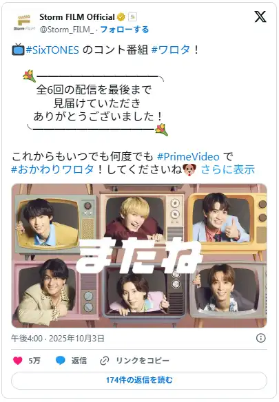 現配信再生回数が爆増し、コントファンからも「アイドルなのにガチ!」と高評価。 笑いの新境地で、SixTONESの多才さが再確認された番組となりました。