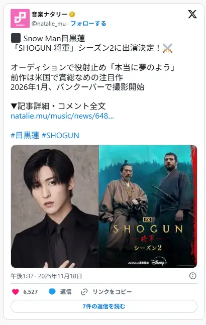 メンバーの目黒蓮さんが1月19日よりハリウッド製作ドラマ『SHOGUN 将軍』シーズン2のバンクーバーでの撮影専念のため撮影期間内はSnow Manとしての活動休止を発表。