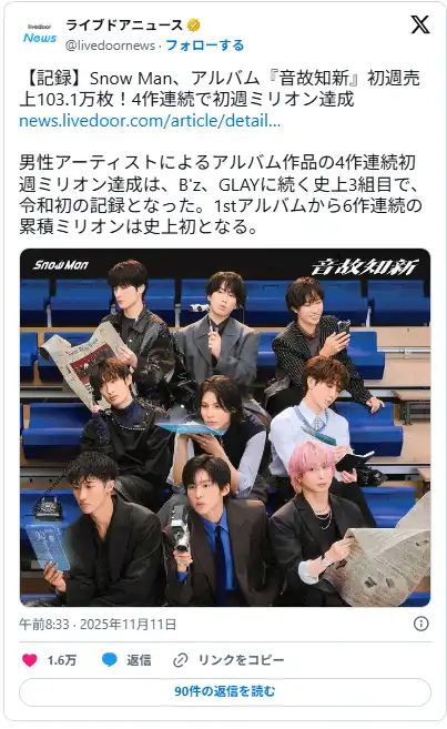 Snow Manの5thアルバム『音故知新』は、初週売上103.1万枚(オリコン)を記録し、4作連続の初週ミリオン達成という快挙を達成しました。